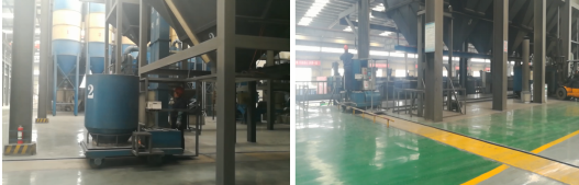 由于该企业原有厂房车间高度问题,无法实现直接的配料、混料。所以针对老厂房的问题需要先配料,再通过送料小车移动到到另一个料仓下,通过提升输送到料仓然后混料。
