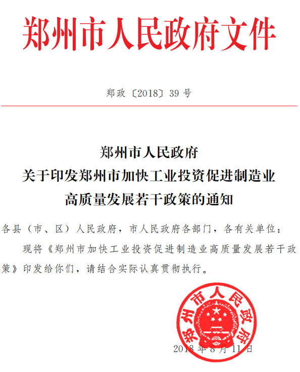 政府在不断督导企业进行改造升级的过程,也在不断为企业考虑,出台补贴政策。8月份,郑州市出台了加快工业投资促进制造业高质量发展若干政策