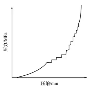 在这个阶段中,耐火砖成型压力已增加到能使泥料内颗粒发生脆性和弹性变形的程度,所以在压制时由于泥料内颗粒受压变形和多角型颗粒的棱角被压掉,从而使坯体内颗粒间的接触面增加,摩擦阻力增大。因此,使这一阶段的压制特性表现为跳跃式的压缩变化,即呈阶梯形变化曲线;当压制进入第三阶段时,成型压力已超过临界压力,即使压力再升高,坯体几乎不再被压缩。下图的这种耐火砖对模具的要求和压力机的选择都要求很高。